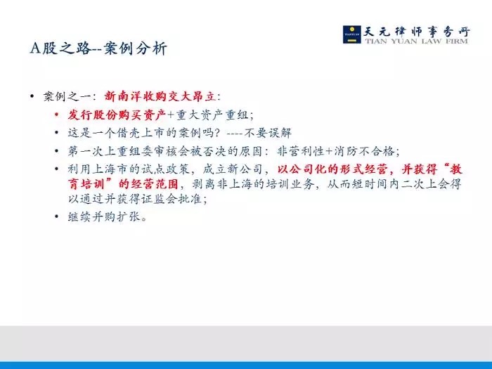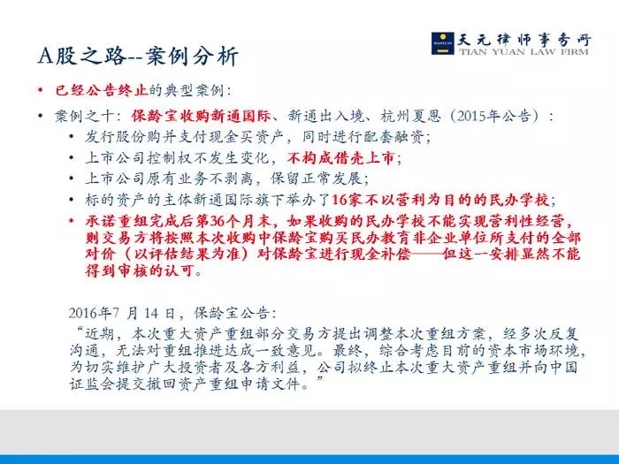 今年另外一个热点案例是保龄宝收购新通国际、新通出入境和杭州夏恩,其中最主要的资产是新通国际。新通国际下面到底是什么资产?新通国际旗下举办了16家不以营利为目的的民办学校来做语言培训、教育培训。这个交易也是不构成借壳上市的,但是这个案子在7月14号保龄宝公告终止了,做不下去了。为什么做不下去呢?他们公告的时候有一个说法:经过多次反复的沟通,交易方无法对重组的推进达成一致意见。这是他们公布的官方理由。我个人从法律角度来观察,如果有法律障碍,会出现在哪里?就在红字这里,因为他有16家非营利性的民办学校。在证监会审核的反馈意见里面,大家也能清楚地看到,反馈意见的问题就问他,这个非营利性的学校,是不是符合上市公司重大资产重组管理办法里面,放进上市公司的资产必须是经营性资产?证监会说经营性资产首先就必须盈利,如果不能盈利,怎么叫经营性资产呢?这个问题保龄宝已经没办法解决了,他们写了一段说法,说我们承诺在重组完成后的三年,第36个月末,如果收购的民办学校仍然不能够实现营利性经营,我们把它买回来。在我个人来看,保龄宝也好,新通教育也好,他们已经拿出了足够大的诚意,我先放进去,如果三年以后《民办教育促进法》还没改完,营利性的问题还没办法解决,我原价加利息把他买回来,他们是这个说法。显然这个逻辑没有办法被证监会所接受,大家知道证监会的基本逻辑,你放进去的资产应该本来就是合法合规的,不能说现在还不能盈利,等三年,如果还不行再拿出来。如果这样,很多人就会效仿这个案例,证监会很多案子就没法审了。这个逻辑最终没有得到审核的认可,在这种情况下,这个案子也是没有办法,不得不终止。从这个案子来讲,跟前面我们讲的龙文、学大有什么区别呢?区别在于他们是公司化经营的,保龄宝是用民办学校牌照经营的,解决不了这个问题。他们必须要等,要么关掉16家学校,换成16家公司,最好能拿上教育培训、非学历培训这样的经营范围,否则就得等《民办教育促进法》修改完成,这就是比较痛苦的地方。