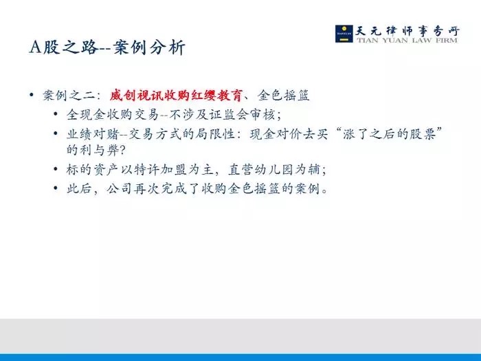 第二个案例看一下威创视讯收购红缨教育,以及后来他又做了金色摇篮等等好几个案子。这个案子的特点是一个全现金的收购,而且不构成借壳上市,它是一个正常的并购。在全现金交易的情况下,正常并购是不需要证监会审核的。但是这个案子的局限性在什么地方呢?它用现金,我印象中大约是五个亿左右去买了红缨教育以后,是有业绩对赌的,为了保证被收购方能够继续积极的经营好被收购的企业,要求你拿获得的现金对价去买我上市公司的股票。你拿了五个亿,可能要拿出其中一部分钱,一个亿还是两个亿去买我的股票,买完股票以后锁定在那里,通过间接的方式绕过了发行股票购买资产,绕过了证监会的审核。问题在于什么呢?你在并购消息公布之前你是不能买股票的,去买了就构成内幕交易了。红缨教育的股东方要去买上市公司的股票,他要等到整个交易公开了以后才能去买,获得了价款以后才能去买,这个时候的股价是涨了以后的股价,这种交易模式具有天然的缺陷,就在这个地方。不能够实现刚才讲的发行股份购买资产,换股交易的好处。
