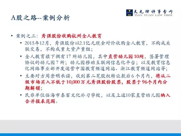 第三个案例是秀强股份收购杭州的全人教育,交易模式跟刚才的威创收红缨教育是类似的,用2.1亿现金收购全人教育。全人教育有直营幼儿园10所,还有7所管理的幼儿园。主要对方周崇明承诺,收到第二笔股权转让款后6个月内,将从二级市场买入不低于一个亿的秀强股份的股票,而且要锁定96个月,非常长。这基本上是类似的交易模式。