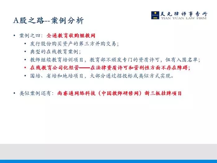 第四个案例是全通教育收购继教网,一个非常有影响力的案子。在线教育的案子没有太大的法律问题。大家一开始看可能会觉得,继教网的业务不是培训学生的,是培训中小学教师的,给中小学教师做继续教育培训的。当时我们关注这个案子的地方是,培训老师要不要有牌照,要不要有一张学校的牌照你才能够去培训教师,能不能够用公司的方式来做?事实上是可以的。实际上继教网的客户就是教育部和各省的教育厅、各地的教育局,客户直接就是教育部,但是教育部并没有给他发任何牌照或者是经营许可。也就是我刚才一开始跟大家强调的,其实在线教育现在在法律上的障碍基本上是没有的,只涉及到招投标的问题。因为你的客户是教育部,实际上是一种财政预算性的政府采购。类似的案例还有尚睿通,这个是行业内的老二(继教网是老大),这是一个新三板挂牌的项目。