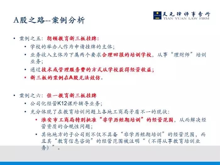 第六个案例也是新三板的案例。佳一教育是采用公司化经营的,他做的业务又是K12的课外辅导。他起家的地点是淮安,淮安市工商局特别给他批了一个经营范围,叫非学历短期培训,所以佳一教育拿着这张执照跟股转公司说,我的经营范围里面有非学历短期培训,我不用民办学校的牌照,我也不归教育局、教委管,我直接拿着公司的营业执照就可以干。这个案子最终获得了新三板的审核,也成功挂牌了。但是是不是到全国各地都可以像淮安这样给你一个经营范围的审批是不一定的,还是面临非常多困难的。