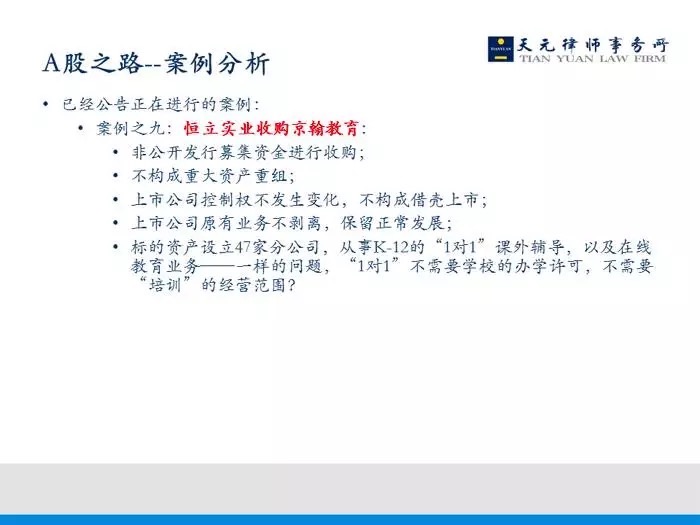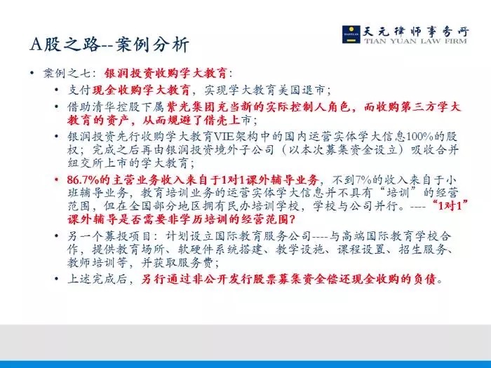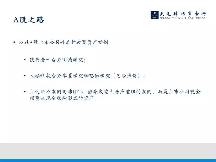1、《民办教育促进法》如果不完成修法,没戏,民办学校就无法经过证监会批准实现教育类资产的证券化。大家注意,我说的主语是民办学校,不包括公司。但有可能通过现金并购或者是公司化的经营,有限的实现注入A股上市公司。如果你的主体是民办学校的,《民办教育促进法》不改,你放不进去;如果是公司化经营的,或者是现金并购的,有可能有限度的放进去,待会儿我们看案例。