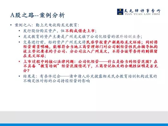 第八个案例,今年最新的一个案例,勤上光电收购龙文教育。这个案子跟之前别的案子有一个共同点,同样不构成借壳上市,交易完成以后勤上光电的大股东仍然是原来做LED的李总。但是他在注入上市公司之前,龙文教育做了一个重组,什么重组呢?把民非学校的资产剥离给龙文环球,龙文环球在这次交易里面没有放到上市公司里面去,是外面的一个公司。大家可以看出来,他把民非学校剥离,同时把符合一定条件的、公司制经营的辅导机构注入到广州龙文,广州龙文是要放到上市公司里面去的。他把经营前景比较明确的、营利性比较确定的公司化经营的课外辅导机构,通过重组,放进上市公司里面,而把民办学校都拿出去了。为什么他做这个呢?就是回避了民办学校的非营利性问题,使他在整个上市的过程中不构成法律障碍。上市过程中一个核心的问题是什么呢?公司化经营,什么是恰当的经营范围?如果大家具体去看他们的重组报告书的话可以发现,广州龙文的一部分公司是有教育培训这个经营范围的,但是他有更多的学校是没有这个经营范围的。没有这个经营范围的时候,证监会给他的反馈意见也非常尖锐的问这个问题,你的经营范围里面没有教育培训,合法吗?他们没办法,他们就拿了一大堆各地工商局的合规性证明来满足了证监会的审核。我个人还是赞同这个审核结果的,应该还是让他过。但是大家看到他的结果,过的时候,证监会要求他给投资者,给资本市场一个风险提示,他是一个有条件过会。有条件过会附的条件是什么呢?请申请人补充披露相关民办教育培训机构政策的不确定性对标的公司持续经营的影响,其实就是指这个问题,他的法律合规性还是有一些疑问。