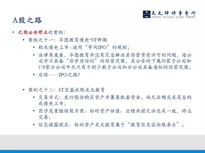 另外两个案例,一个是华图借壳ST新都,也是终止了。还有龙文被收购之前还跟ST宏盛做了一次,也终止了,不多说了。我估计华图,因为华图最大的业务是公务员考试培训,这一次借壳上市失败以后,今年大家都知道华图做了一轮比较大的定增,跟很多私募基金机构做了一轮定增,估计后续应该是会等《民办教育促进法》修改,然后走IPO的道路,我个人观察认为是这样。