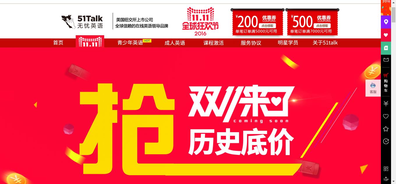 51Talk在天猫的旗舰店打出“历史底价”吸睛。从11月1日起,51Talk就开始为双十一预热了。1日到8日,51Talk推出“1元秒杀”价值99元的成人和青少年外教体验课,及原价480元外教口语集训课的1折优惠。9日到11日,51Talk几项成人课程开展限时特价,降价幅度从100到2400元不等。多个次卡课程包同步优惠,51Talk的这次双十一展示了足够的诚意。