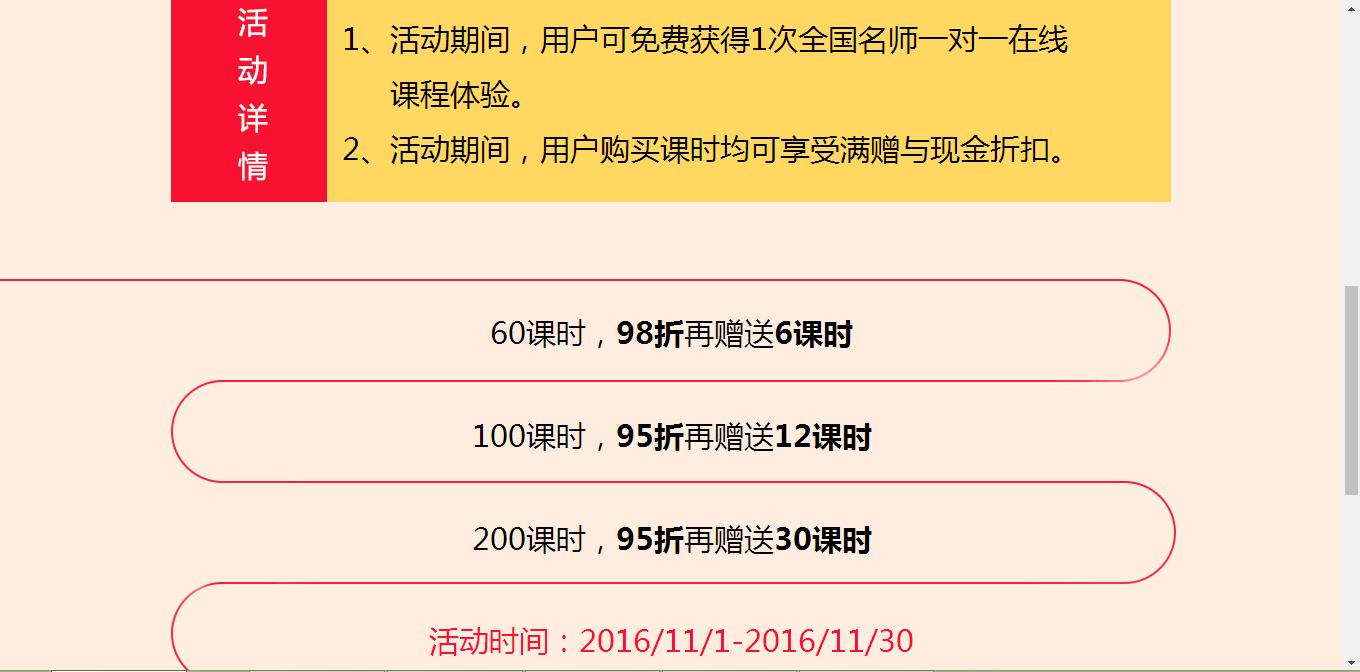打折又送课,而且活动时间持续整个11月,100教育也是挺拼的。这是要在力度和长度上双管齐下的节奏啊。