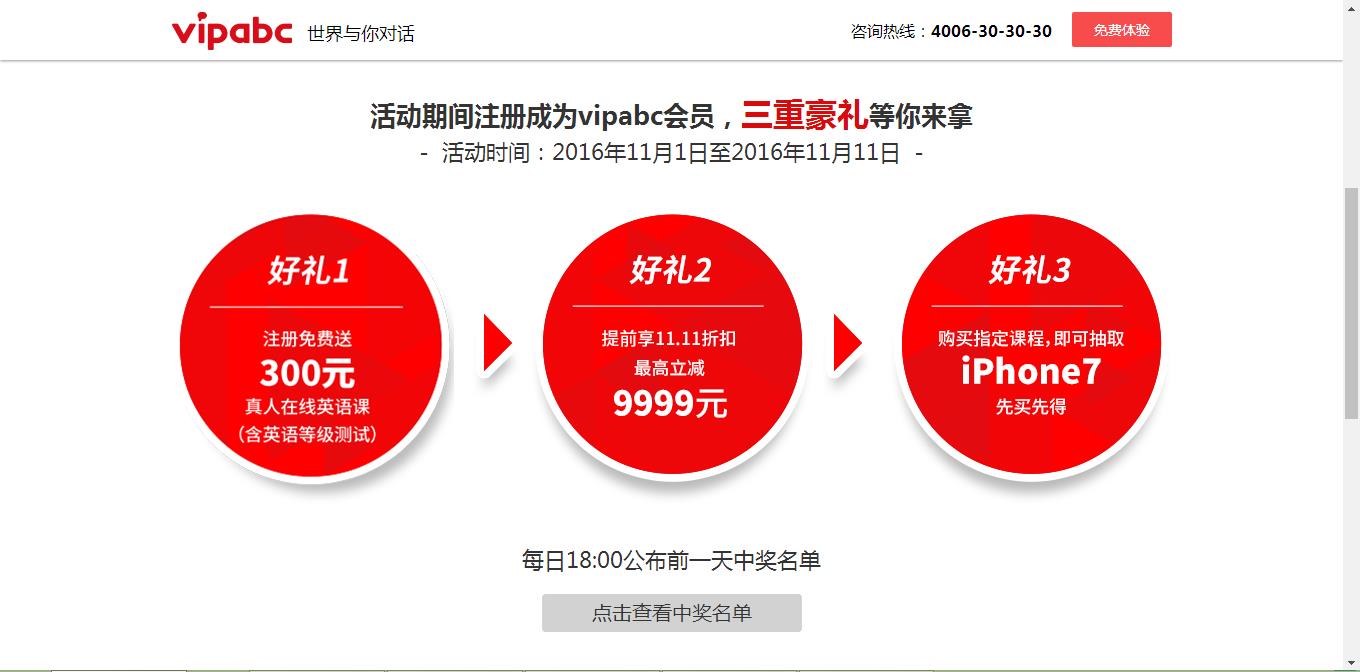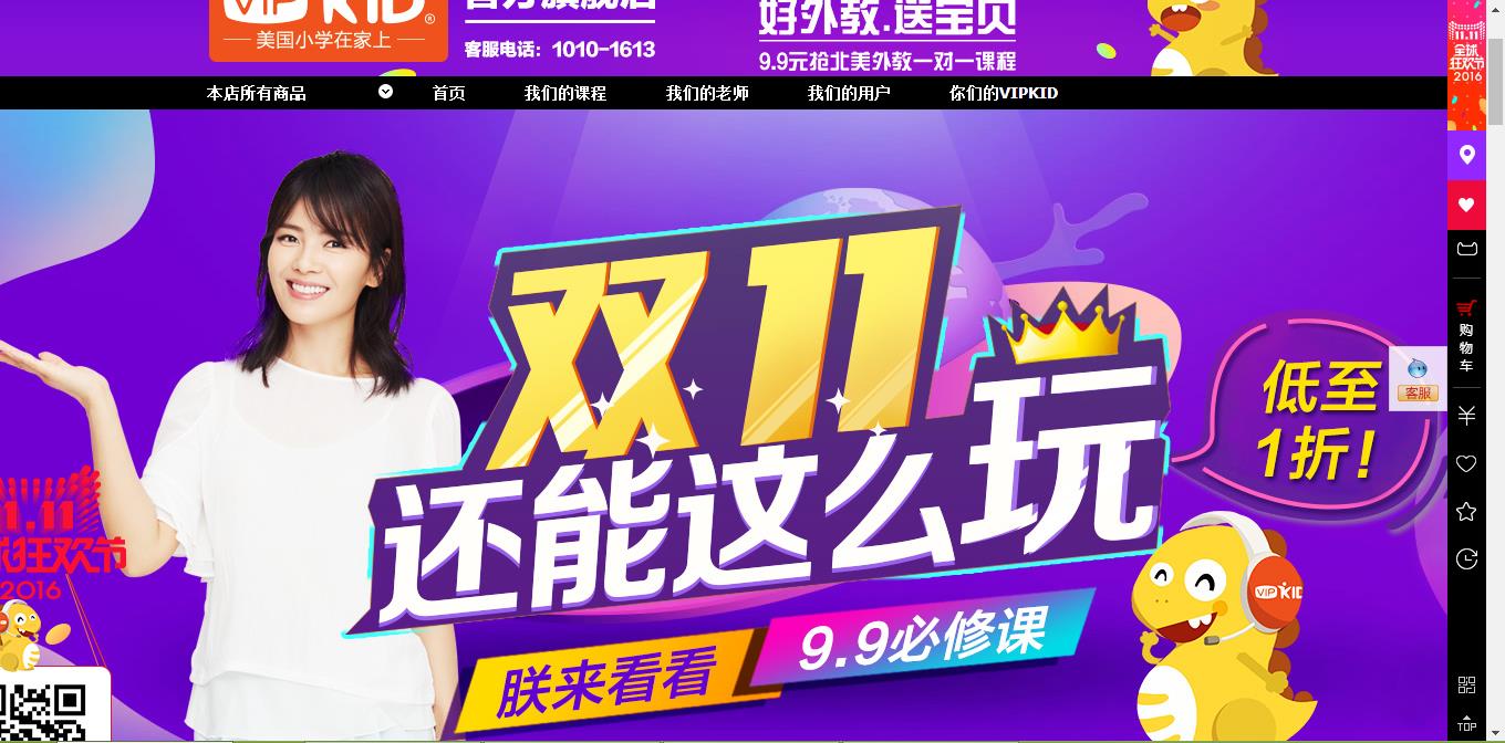vipabc除了在官网上卖力吆喝双十一活动,在天猫和京东的旗舰店也同步促销。除了常规的打折和立减之外,vipabc促销界面显示,购买一年级以上产品的客户在双十一当天交易,还有机会获得限量礼品iPhone7,也是赚足了眼球。