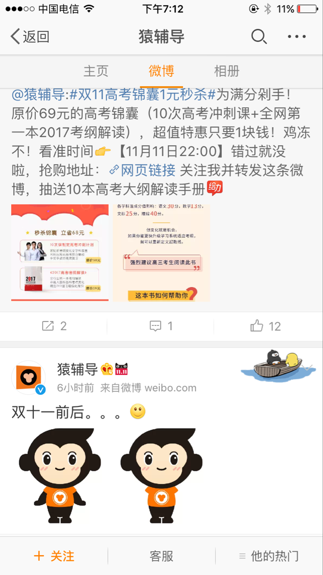 猿辅导推出了1元秒杀原价69元的高考锦囊,内含10次课程和2017年考纲解读,双十一当天22:00开始抢购。
