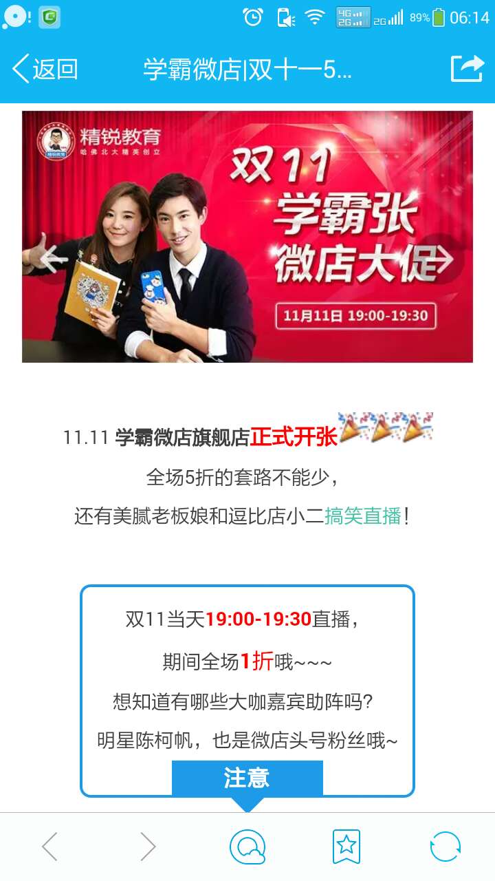 精锐教育的学霸微店选在了双十一开张,打折卖周边,产品包括精锐创始人兼CEO真人故事改编漫画、二次元形象的手机壳和各种文具。另外,精锐派出和范冰冰在《武媚娘传奇》里演过对手戏的小鲜肉陈柯帆来当店小二,在双十一19:00到19:30直播售卖,直戳迷妹少女心。