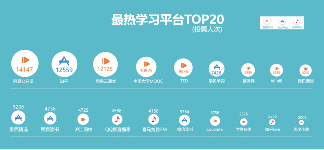 值得注意的是,TED、Bilibili这类非传统意义教育资源提供者也进入了学习者视野,跻身前十,同样受到了知识青年们的追捧。微课、喜马拉雅FM等音频平台和知乎、扇贝单词等App产品,也成为了在线学习者的重要知识获取渠道。