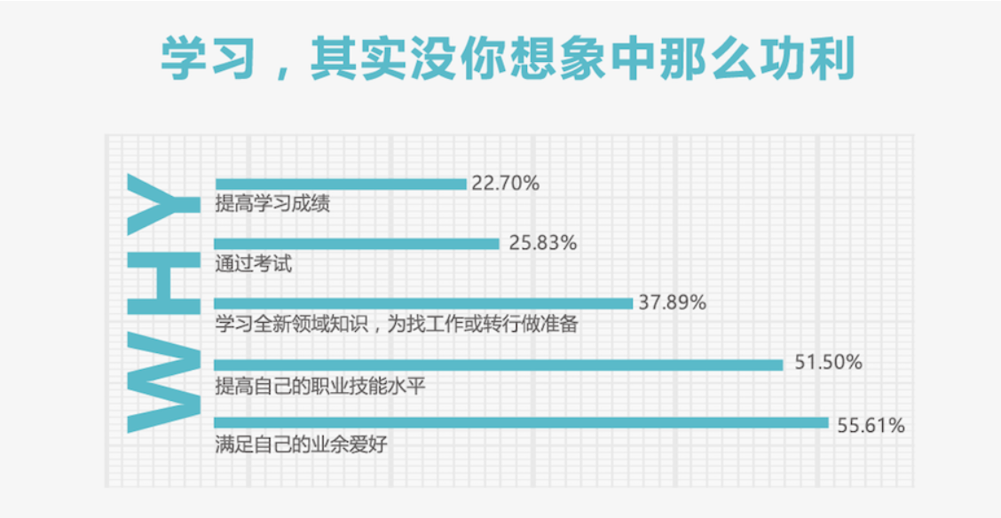 对于大多数学习者,兴趣爱好培养和职业技能的提升是选择在线学习的主要原因。提高学习成绩及通过考试这类传统学习方式催生的需求,在互联网时代下或不适用,即使在学生群体中仍不是重要因素。