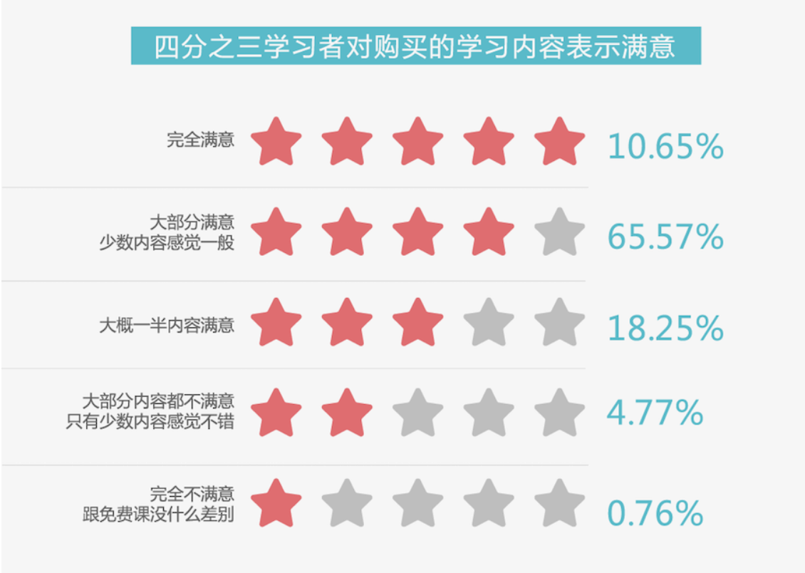 从人们对购得学习产品满意度来看,内容质量得到了大多数知识消费者认可。取悦消费者不易,学习者愿意付钱,或促进了高质量的学习内容供给。