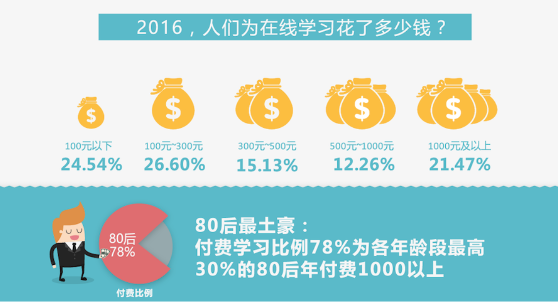 在知识消费金额上,半数学习者过去一年的消费集中在300元以下。陆续进入而立之年、有更强消费能力的80后,是付费学习的主力军。