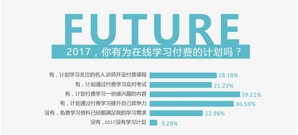 内容优质、形式翻新的在线学习也激发了更多用户的付费意愿。计划在新的一年里继续为在线学习付费的学习者占据了绝大多数。相较于往年,2016年在知识获取形式不断革新、知识划分领域不断细化、知识提供者的数量持续增加的环境下,“知识付费”在未来会获得更多学习者的认同,知识青年大军也会持续增长。(多知网 黎珊)