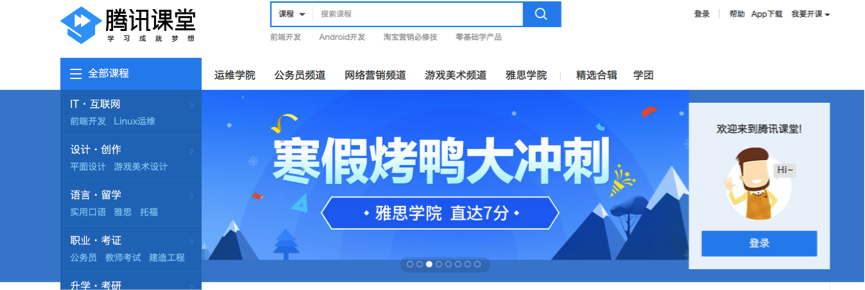 付费能力转化方面,提升机构、课程、学员三者之间的匹配度。腾讯课堂将会大力推广学院制和系列化课程。比如腾讯课堂官网,除了最上面的搜索栏和左侧的全部课程外,还将运维、公务员、雅思、网络营销等细分领域单独列出。每一个细分领域都包含有多家机构的课程。