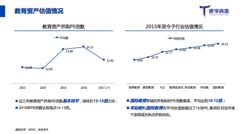 二级市场最近几年的估值情况来看,教育行业的并购相对比较稳定,约在12到15个月之间,“2016年是市场最热的时候,可能给了略高的价格,在子行业的估值中,相对来讲可以拿到比较高PE倍数的是早幼教和国际教育。”