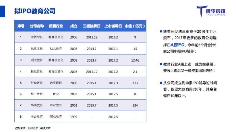 桃李资本创始人张爱志预测,2020年教育行业市场规模将达到3万亿,2020年教育行业互联网渗透率也将达到10%,从资产证券化层面,按照三万亿的市场算,A股这类主流市场将至少有400家以上的教育上市公司。此外,随着新东方和好未来市值突破100亿美元,标志着中国教育市场的关键资本节点。