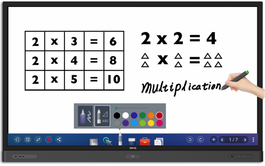 BenQ互动触控屏的预装软件--EZWrite,让用户可以一键将触控屏切换成白板模式,并且将用户所写下文字、数字、表格转换成数字格式,能进行数学计算和几何公式等运算;在某些模式下,可以开启浮动工具箱,让用户可以使用橡皮擦、录像、打印等常用工具。另外,菜单栏提供的多功能工具箱里,有计算器、蜂鸣器、记分板、绘图等工具。