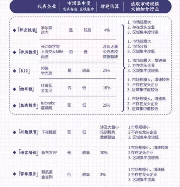 手册中,对目前教育行业不同领域的数据、不同类型教育机构的市场增速、集中度进行了对比,并对不同种类教育的广告投放难点做出了分析。