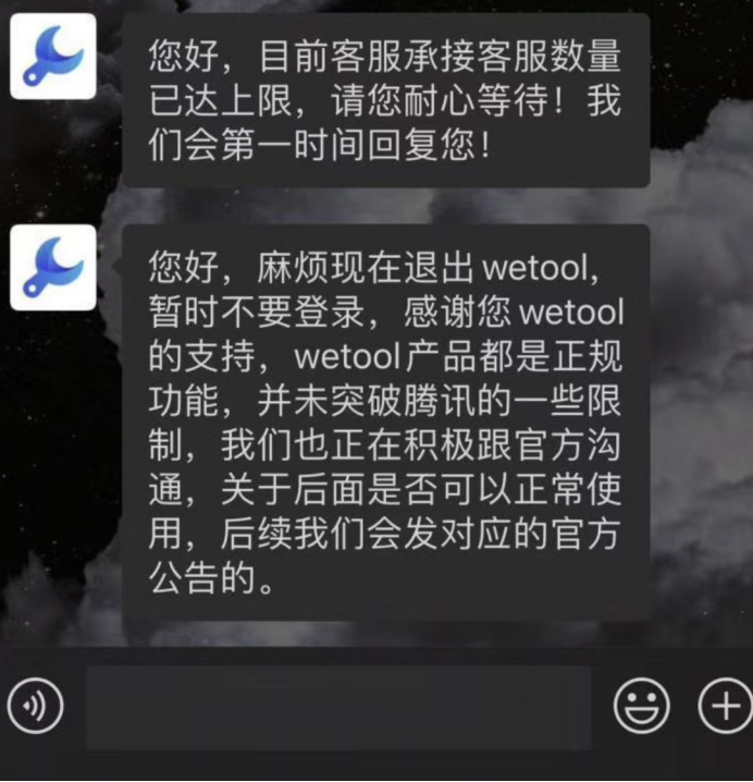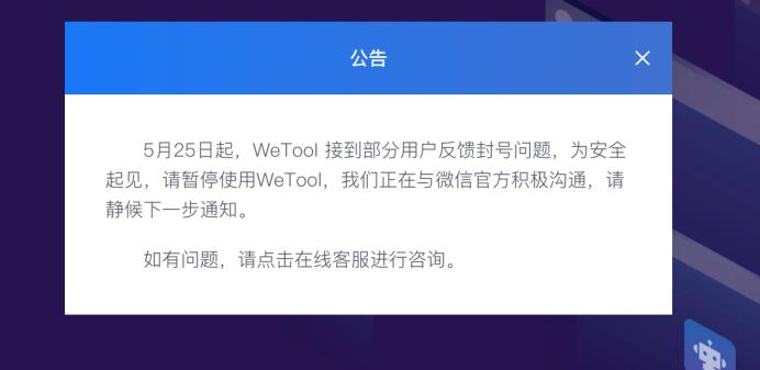 在接到用户微信号被封号的消息后,WeTool官方客服表示,25日傍晚6点,封信封杀了一波使用WeTool工具的账号。晚上9点左右,传出了推宝科技创始人CEO刘睿泳及WeTool客服的通知:“请都退出WeTool,不要再用了,感谢大家的厚爱,我们自认为都是正规的功能,正在同方沟通。作为微信生态多年的第三方开发者,我们尊重官方的决定。也会妥善处理好后续事宜。”