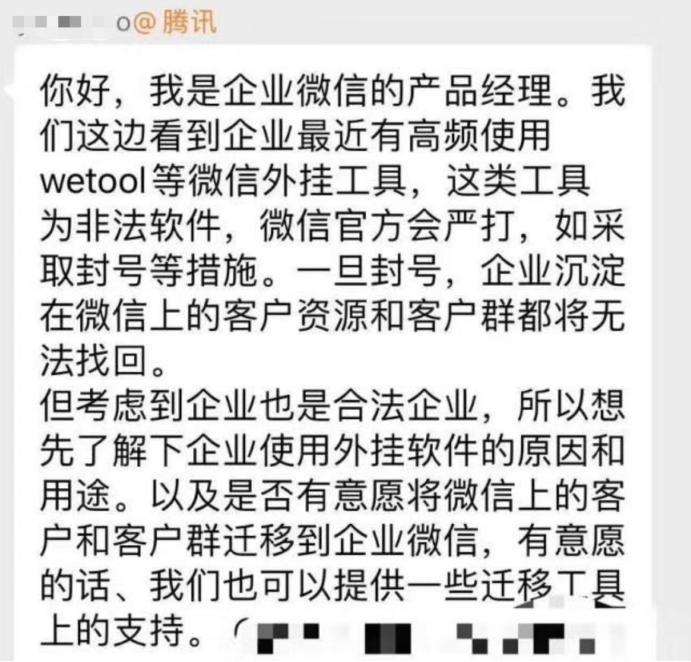 未来企业微信或许会替代WeTool,此前,微信与企业微信功能早已打通。昨晚,有传出的自称是企业微信产品经理的账号截图显示:“WeTool等微信外挂工具为非法软件,所以微信官方会严打,不过,如有意愿,可以把客户群迁移至微信企业,微信也会提供迁移工具。”