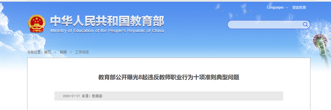 多知网7月27日消息,今日,教育部公开曝光8起违反教师职业行为十项准则典型问题,包括体罚幼儿、学术不端、受贿等方面。教育部表示对违规行为要保持高压态势,坚持力度不减、尺度不松、态度不变,坚决惩处违规行为。