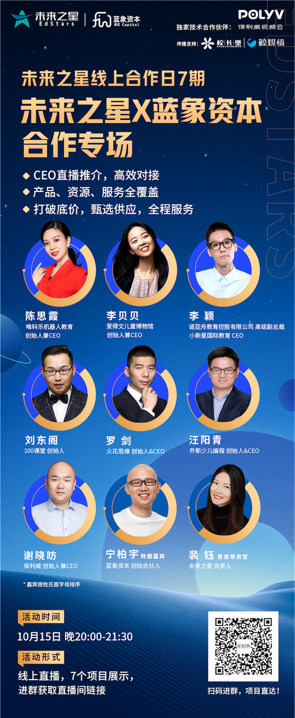 10月15日(周四)晚8点,未来之星线上合作日7期:蓝象资本合作专场将带来7个项目,它们分别是:100课堂、保利威、火花思维、小新星国际教育、乔斯少儿编程、爱得文儿童博物馆、唯科乐机器人教育,推介在线教室和在线考试平台、教育视频云平台、线下课堂+线上城市合伙人分销、幼少儿英语教育创业加盟、青少儿编程教育、儿童教育博物馆服务、机器人教育等优质教育产品及服务。