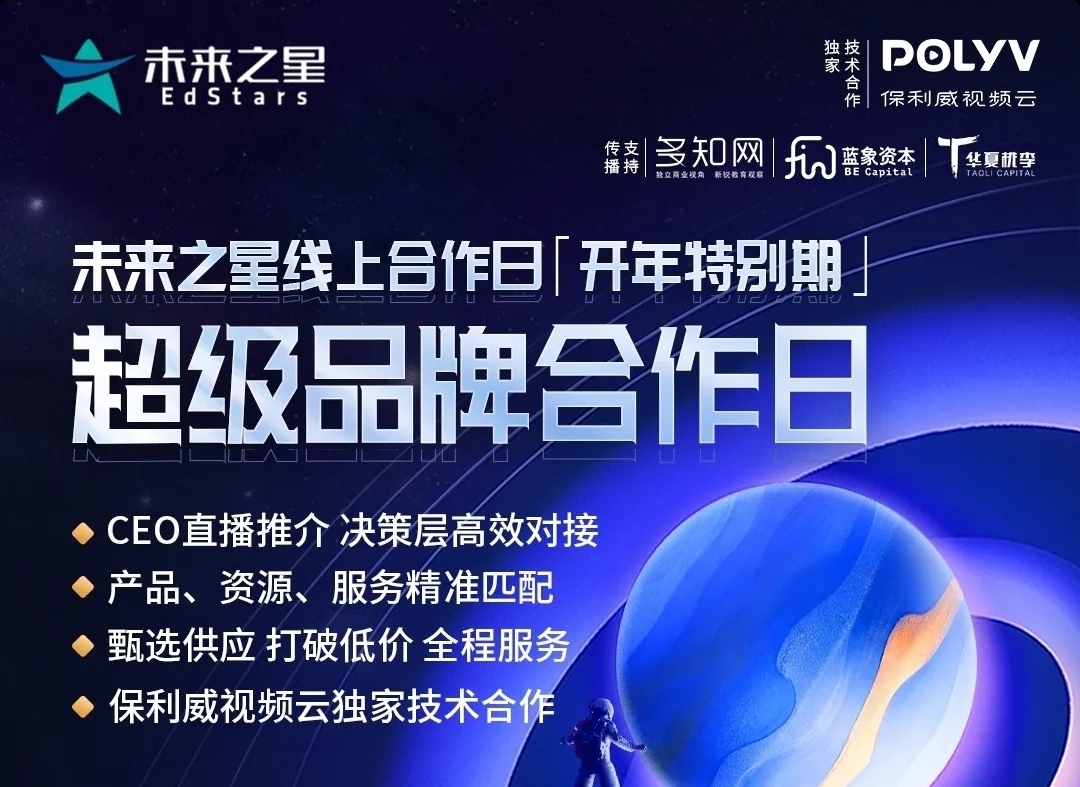 多知网3月19日消息, 3月23日(周二)晚8点,未来之星线上合作日带来「开年特别版」,携手7个超级品牌:腾讯教育、京东教育、豌豆思维、乐乐课堂、即构科技、鲨鱼公园、多知网,推介教育生态SaaS中台、电商平台入驻、数学思维直播课进园方案、名师录播双师课系统、线上教学平台、STEAM课程材料加盟分销、《培训行业这一年》“内培宝典”等优质教育产品及服务。欢迎同学们上线交流!