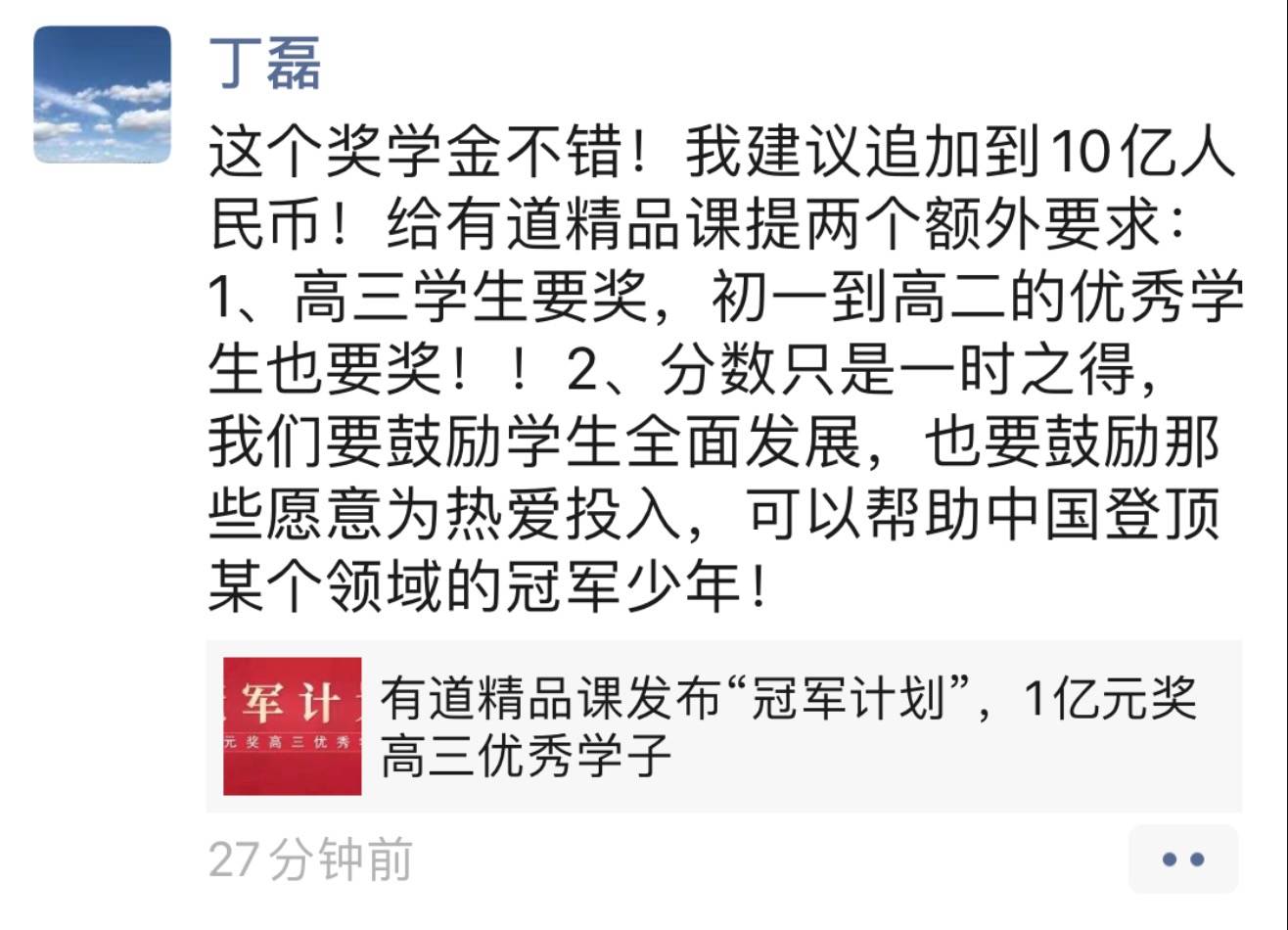 没成想,网易CEO丁磊看到后十分赞同。他转发在朋友圈并宣布了“冠军计划”进行升级:一是奖金提升至10亿元;二是,扩大奖励范围,从初一至高三所有系统班的优秀学员均可申请;三是提出分数只是一时之得,鼓励全面发展,要鼓励那些愿意为热爱投入,可以帮中国登顶某个领域。