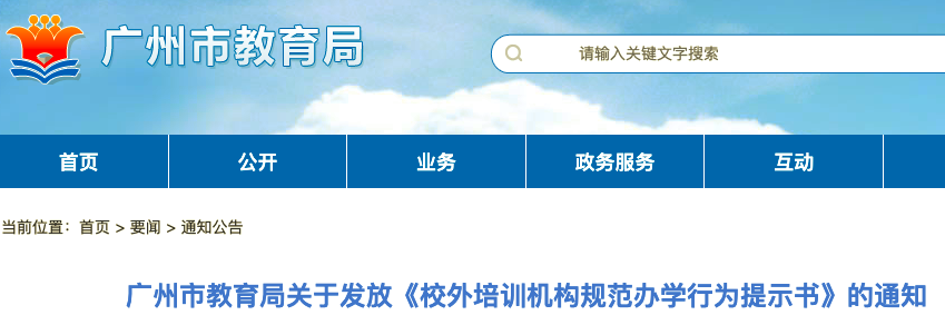 校外培训作为一项教育活动,属于公益性事业,是社会主义教育事业的组成部分。近年来,一些校外培训机构无证办学、违规开展教育教学活动,对冲了国家在加大基础教育投入、减轻中小学生课业负担等方面作出的努力。本着服务企业群众、规范办学行为、净化培训市场的原则,广州市教育局就相关问题提示如下: