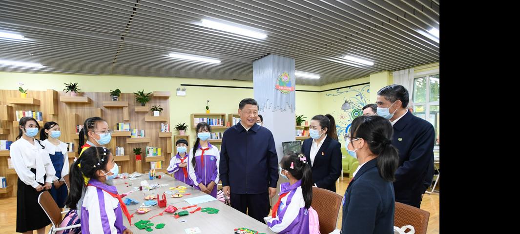 6月7日至9日,中共中央总书记、国家主席、中央军委主席习近平在青海考察。这是7日下午,习近平在西宁市城西区文汇路街道文亭巷社区阅览室,了解社区向青少年提供公益性课后托管服务情况。新华社记者 李学仁 摄