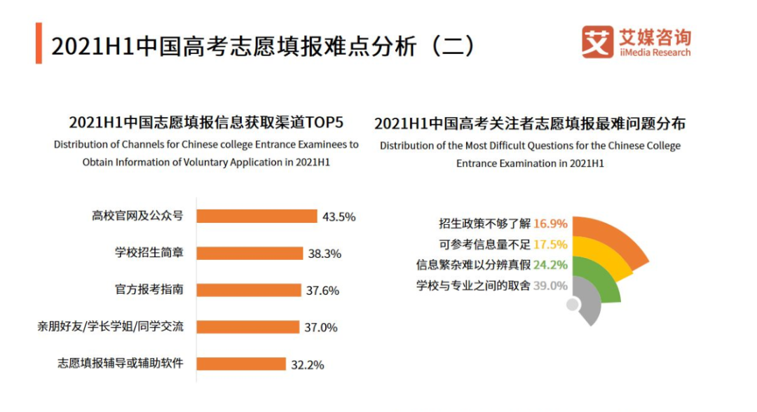 众多因素叠加下,志愿难报让高考志愿付费辅导市场变得更加“火爆”。艾媒咨询数据显示2021年上半年通过志愿填报辅导或辅助软件获取志愿填报信息的比例为32.2%,2020年同期数据为28.2%。
