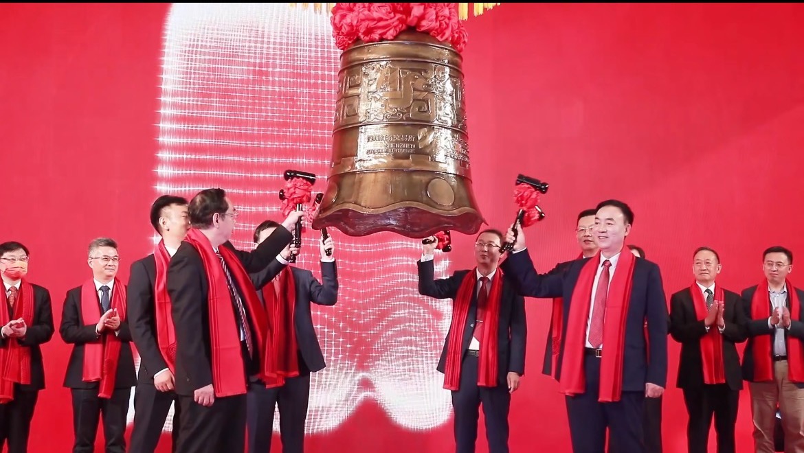 在敲钟仪式上,五星控股集团董事长、孩子王董事长汪建国在敲钟仪式上以《登高望远 脚踏实地》为题,做主题演讲。