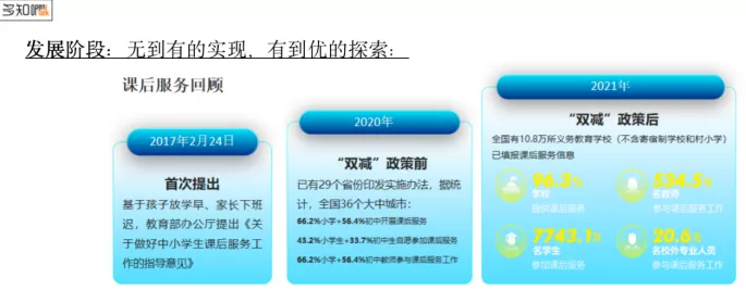 但是在“双减”政策之后,整个比例是被直线拉高了,因为有了政策背景之后,虽然说它是一个延时服务,但是我刚才也提到了即便有一个学生在那个学校里,对于这个学校来说也要为这个场景的工作开展建立一套管理体系。所以“双减”政策之后全国执行力还是蛮高的。我们先暂且不讲它的执行方式是什么样的,但是至少整个延时服务落地执行度上,超96%的开展率已经能够说明家长也愿意把孩子放到学校里面去,学校现在也承担起了课后服务主阵地的角色。