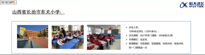 这是其中一个案例,是讯飞课后服务部专为这个场景打造的课后服务管理平台,帮助这所学校的课后服务开展实现了信息化的管理与家校共育模式的打通。通过我们的AI排课系统,帮他们解决了1890名学生走班排课工作量。长治市属于全国“双减”试点城市之一,东关小学的课后服务是长治市做的比较深比较早,跑得比较快的学校。他们是所有师生全部参与,开了90多门课,每周260多节课的课表,从课程、师资、教室的排课上架到家长选报再到一系列数据统计形成全面性的数据看板,帮助学校管理者更好的掌握即时信息;