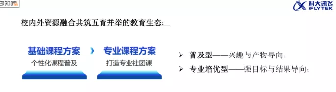 另一方面,我们在做到五育融合并举教育生态打造过程中,我们做了大类的总结,一种是属于普及型,多元化的兴趣小组课程;另外一种是专业型,专业社团课程。