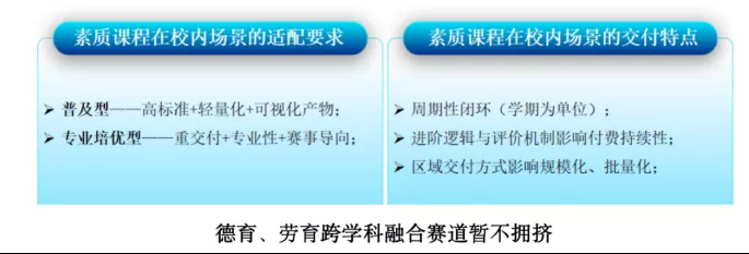 2、“五育融合并举”的素质教育课程有两大类型:一种是属于普及型,个性化兴趣小组类的课程;另外一种是偏专业型,专业培优社团课程。而教研高标准、交付轻量化、结果可视化产物的课程,对学校里的普及型来说更合适;专业社团课程在师资与随材配套存在重交付、但具备明确的结果导向或赛事导向的更适合专业培优型。
