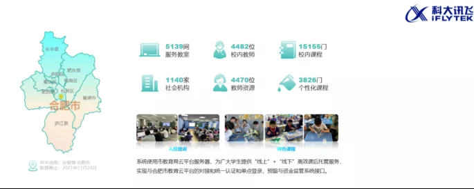 再比如说,这是我们合肥的一个案例,也是使用的讯飞课后服务管理平台,属于市级课后服务管理平台部署,基于大数据看板部分呈现,可以看出该城市学校在开展课后服务工作中校内外的师资与资源均参与到了这个场景中为学生提供服务;