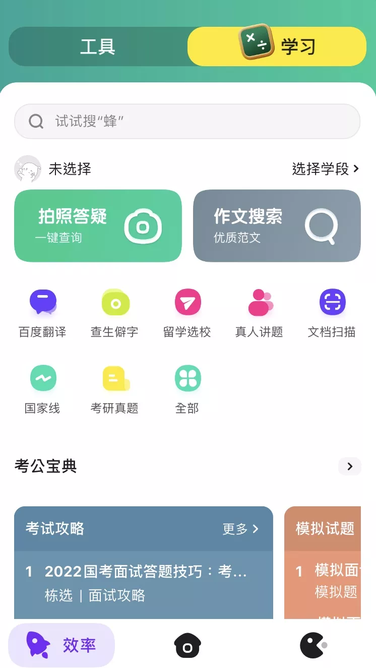 前者包含工具与学习两个类目。在工具类目中,聚合搜题、翻译等学习工具和打车、外卖、快递、租房等生活服务工具;在学习类目中,提供拍照答疑、作文搜索、留学选校、考公宝典、考研真题、国家线、文档扫描、番茄时钟等板块,而后者则在整合当下热搜热梗的同时,为用户提供冲浪、小说、游戏、漫画、视频等娱乐资源。