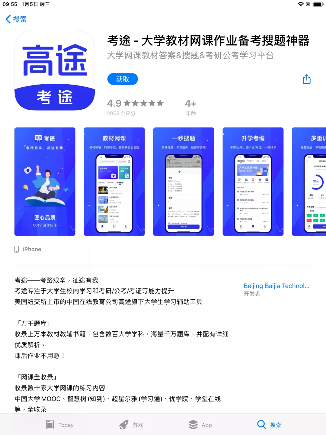 据苹果应用商店开发者信息,考途专注于大学生校内学习和考研考公考证等能力提升,提供教辅书籍、万千题库、网课收录、多模式拍搜题(拍照搜题、文本搜题、扫码搜书)、升学考编等内容。