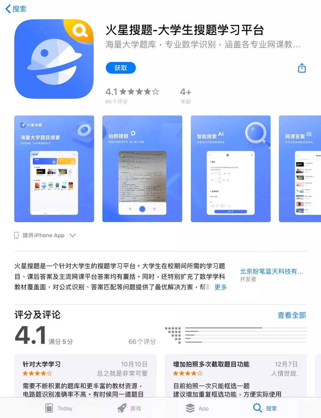 据苹果应用商店开发者信息介绍,粉笔职教旗下的大学生搜题学习平台“火星搜题”App正式于2021年2月在应用商店上线。