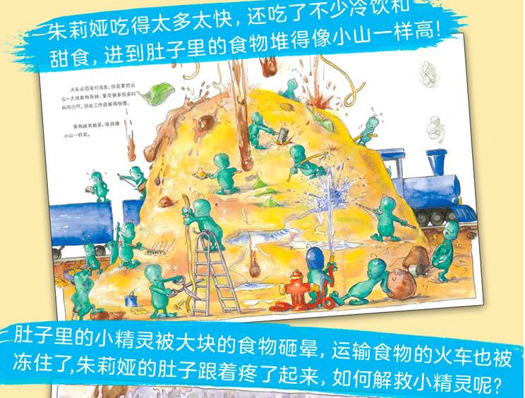 饭菜一大块一大块地掉进肚子火车站里,堆得像小山一样高。这可害惨了肚子里的小精灵们,他们冒着被砸晕的危险拼命干活,想把这些食物统统装上火车,送到弯弯曲曲的隧道里去。可是没想到,还有更大的暴风雪在等着他们。他们游行示威、罢工抗议……