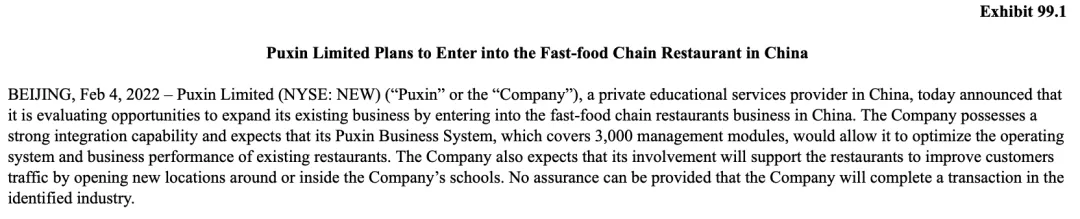 很快,2022年2月4日,朴新教育发布公告称,将进入快餐餐饮行业。朴新教育公告并未提到是自营餐饮业还是收购。从此前朴新教育的发展路径来看,不排除通过收购餐饮品牌来发展新业务。