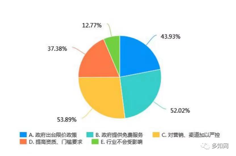 在“‘双减’政策延伸到升学规划行业,您可能有以下哪些方面的担心?(多选)”一项中,从业者同样表现出并不统一的担忧。其中,53.89%受访者选择“对营销、渠道加以严控”,52.02%受访者选择“政府提供免费服务”,43.93%从业者选择“政府出台限价政策”,37.38%受访者选择“提高资质/门槛要求”,仅有12.77%受访者认为“行业不会受影响”。
