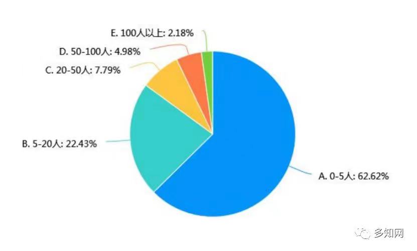 在“贵公司升学规划相关业务,团队人数大约有多少人?”选项中,62.62%的受访者团队为“0-5人”,22.43%受访者选择“5-20人”,二者占比超过87%。相反,选择“100人以上”者,仅占比2.18%。