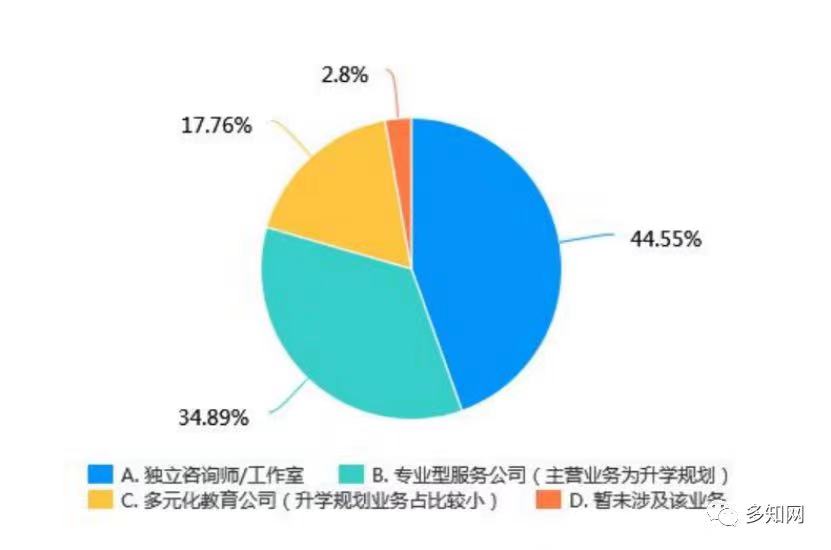 在我们的调查中,44.55%的从业者以“独立咨询师/工作室”的形式存在,34.89%从业者以“专业型服务公司(主营业务为升学规划)”的形式存在,二者占比接近80%。另外,还有17.76%的受访者选择“多元化教育公司(升学规划业务占比较小)”,这种现象,普遍存在于稍具规模的学科培训机构中,如新东方、好未来、学大教育、精锐教育等,均有涉足相关业务。