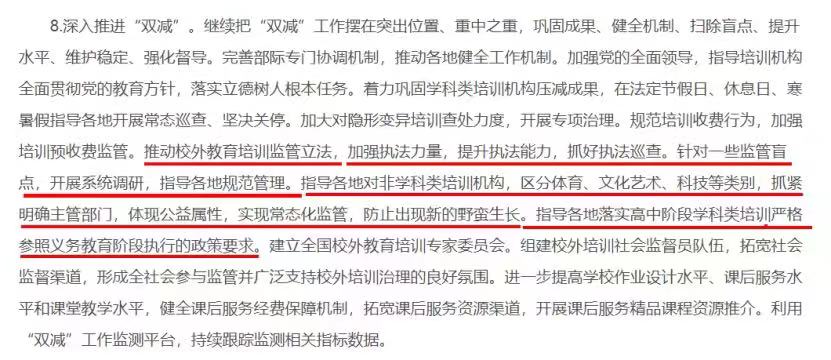 6.对于校外教育培训的监管,将是法律层面。“推动校外教育培训监管立法”,这意味着,监管不会是运动式、一阵风,而是从“指导意见”的层面上升到立法层面。相信相关法律的起草,正在路上,征求意见稿很有可能在2022年下半年出台。