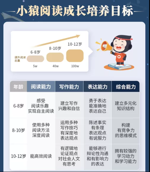 对此,小猿阅读产品团队归纳出孩子需要具备对书籍的概括、预测、联结、图像化、复述、提取关键信息、提问等7大核心阅读能力,并针对每一项能力给出阅读策略和方法。