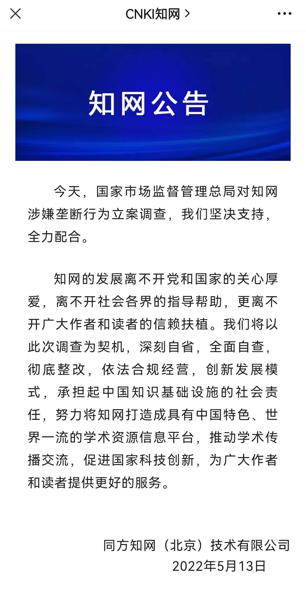 多知网5月13日消息,根据市场监管总局网站消息显示,市场监管总局根据前期核查,依法对知网涉嫌实施垄断行为立案调查。