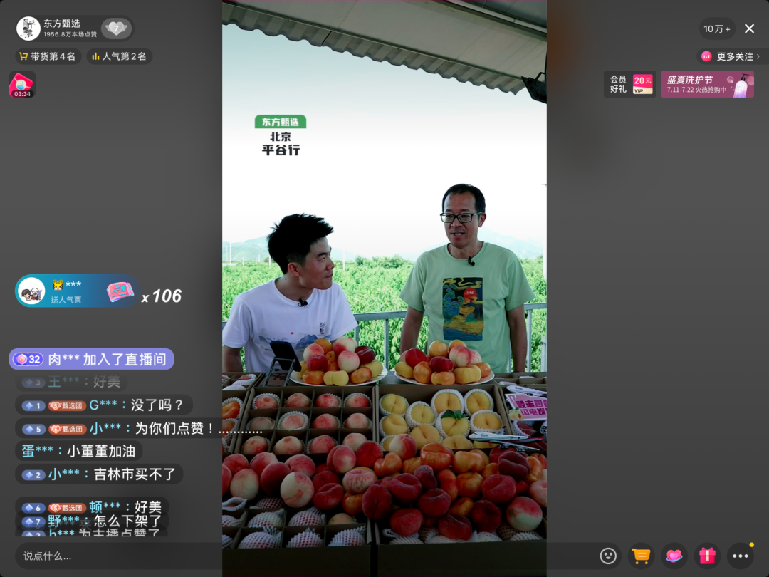 下午3点半,东方甄选直播间镜头切入北京平谷,新东方创始人俞敏洪和东方甄选主播董宇辉出现在平谷桃园现场,本场直播带货产品为平谷产的一万单桃子。